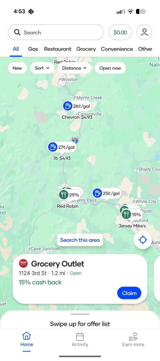 Some locations don’t have this “check-in” feature. You would claim the offer, drive to the store, pay, and then upload the receipt as proof to get your cash back.
